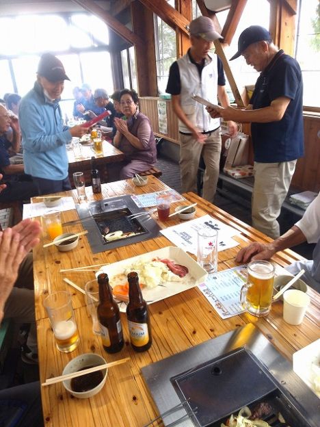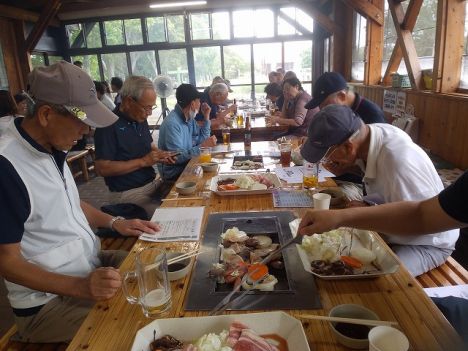 懇親会及び表彰式はさとらんどPGコース近くの「バーベキューハウス」で行いました。懇親会入る前には解散総会(活動・会計収支報告等)を行い、そして表彰式では上位入賞者、ホールインワン者は勿論、参加者にも豪華賞品が渡されました。引き続き優勝者の乾杯で懇親会に入り、立て続けにビールをお代わりしながらでのバーベキューとおにぎりの美味しさは格別で大喜びでした。皆さんは終了時間まで現役時・退職後の話題等で雰囲気も盛り上り、一層の交流を深めた事と思います。